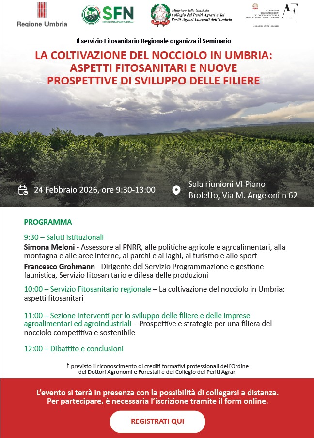 Il Servizio Fitosanitario Regionale organizza il 24 febbraio 2026, presso la sede regionale Palazzo Broletto, Sala Riunioni VI Piano, il Seminario La coltivazione del Nocciolo in Umbria: aspetti fitosanitari e nuove prospettive di sviluppo delle filiere.